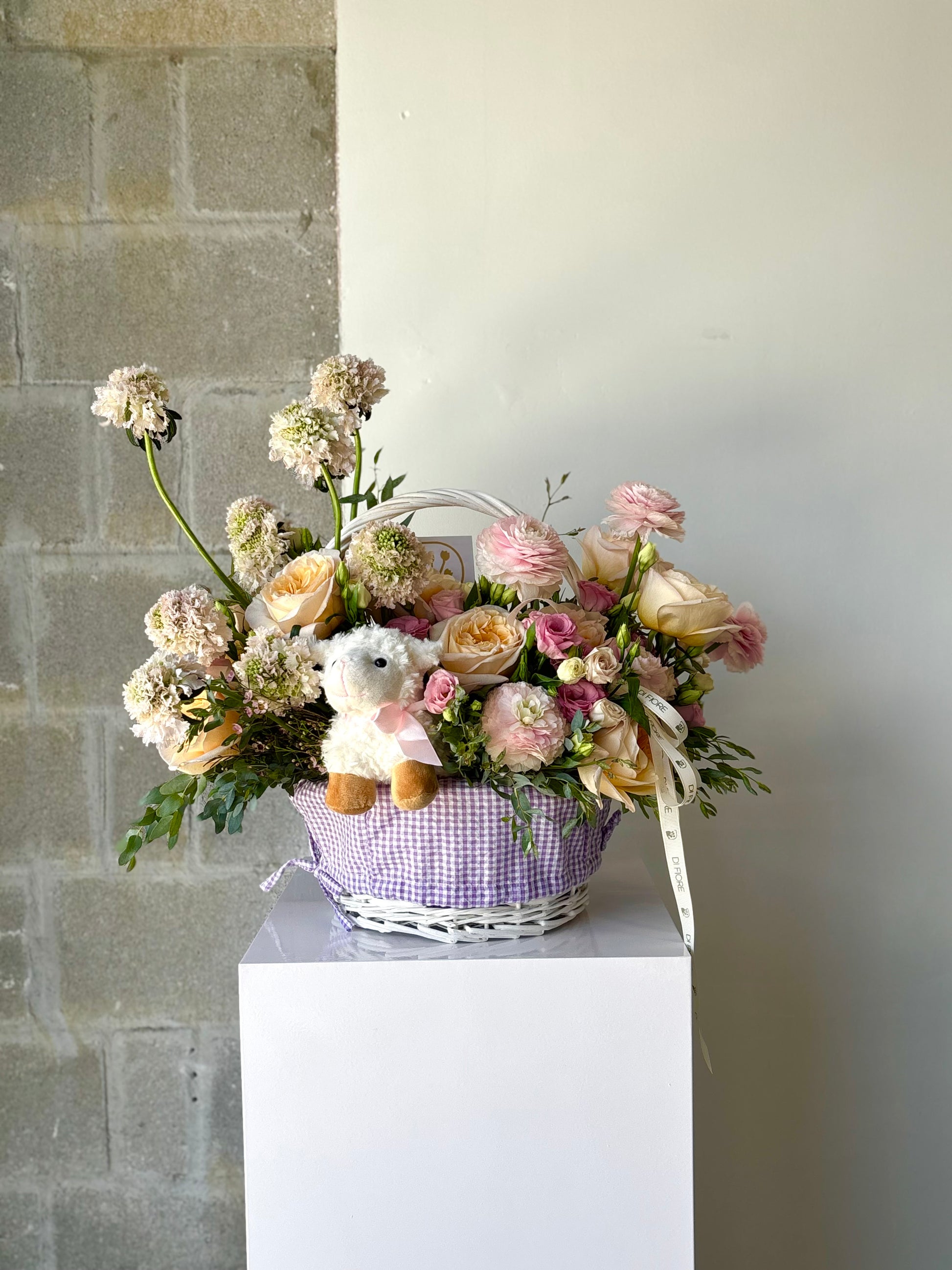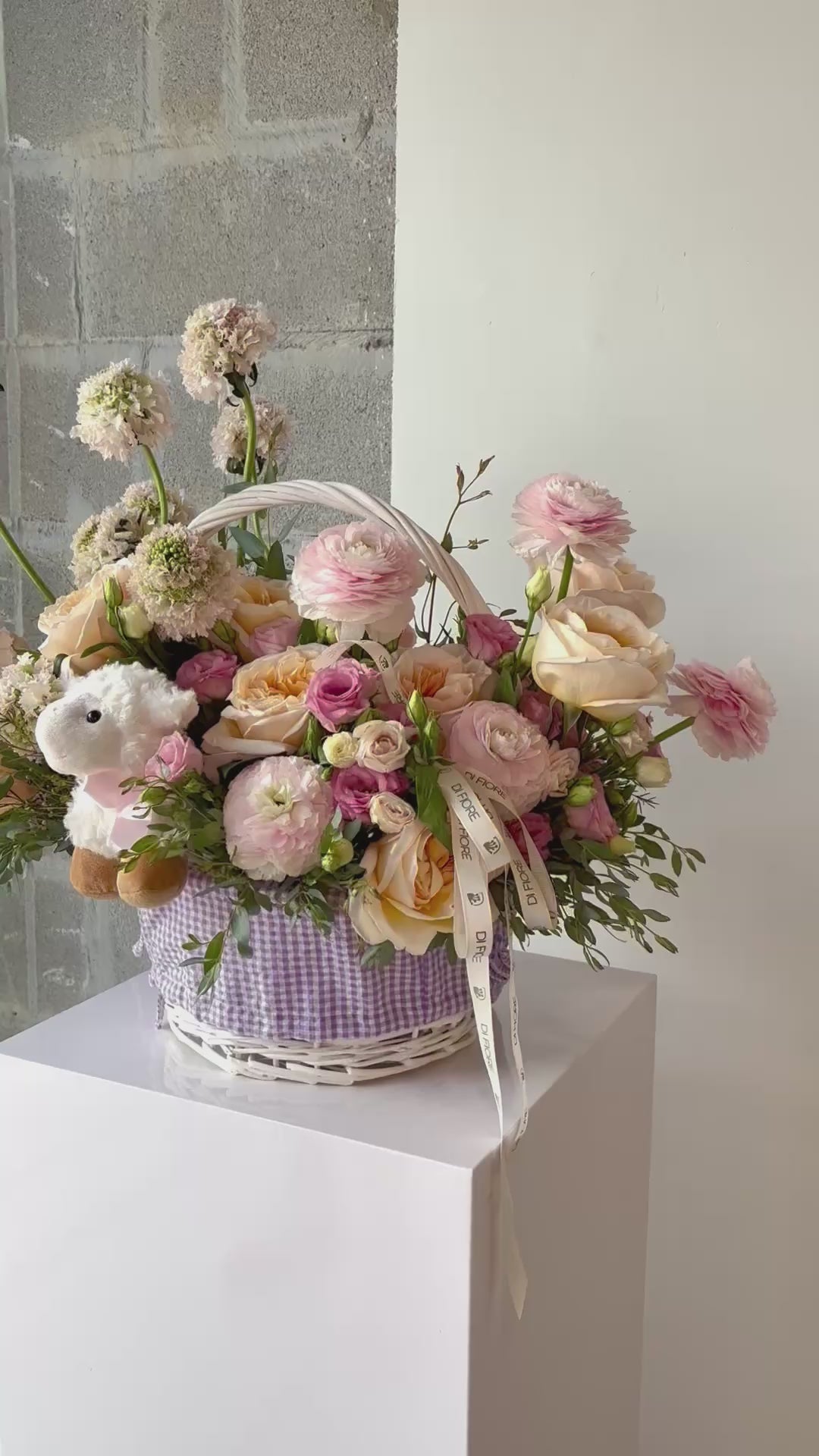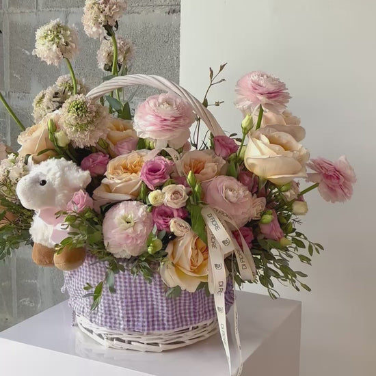 Celebrate new life with the Rafaella floral arrangement, thoughtfully designed in a charming pink basket. Featuring delicate ranunculus, mini roses, and large roses in soft pink hues, this arrangement conveys warmth and tenderness. Perfect for welcoming a baby girl, it combines elegant blooms to create a graceful and heartfelt gift that expresses joy and love.