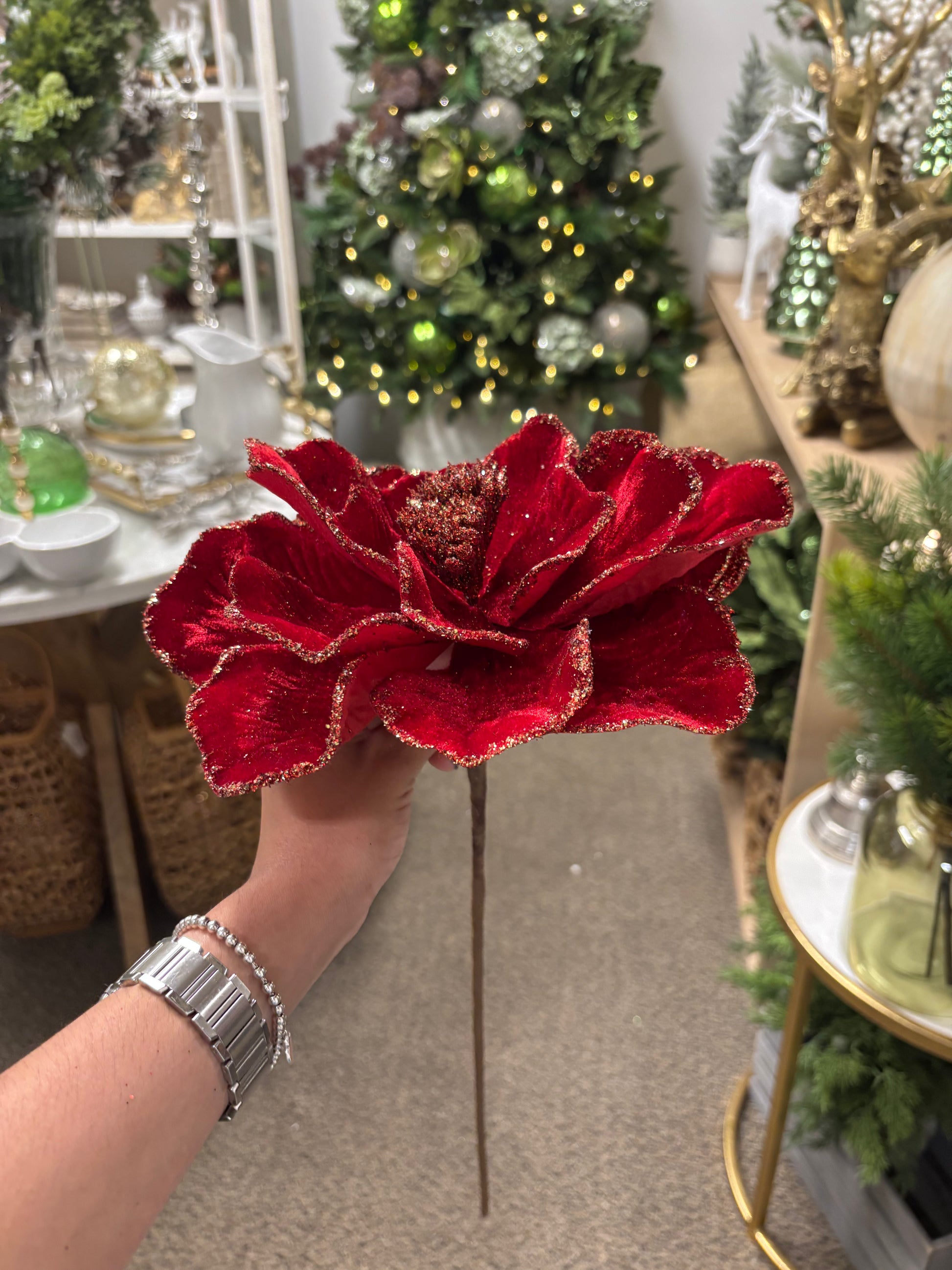 Elevate your floral arrangements with this striking Red Magnolia Stem, enhanced with delicate gold glitter accents that catch the light beautifully. The rich crimson petals paired with shimmering gold detailing create an elegant, luxurious aesthetic perfect for weddings, upscale events, or sophisticated home décor. This premium stem adds depth and visual interest to any arrangement while maintaining a refined, polished appearance. Ideal for creating statement pieces that command attention.