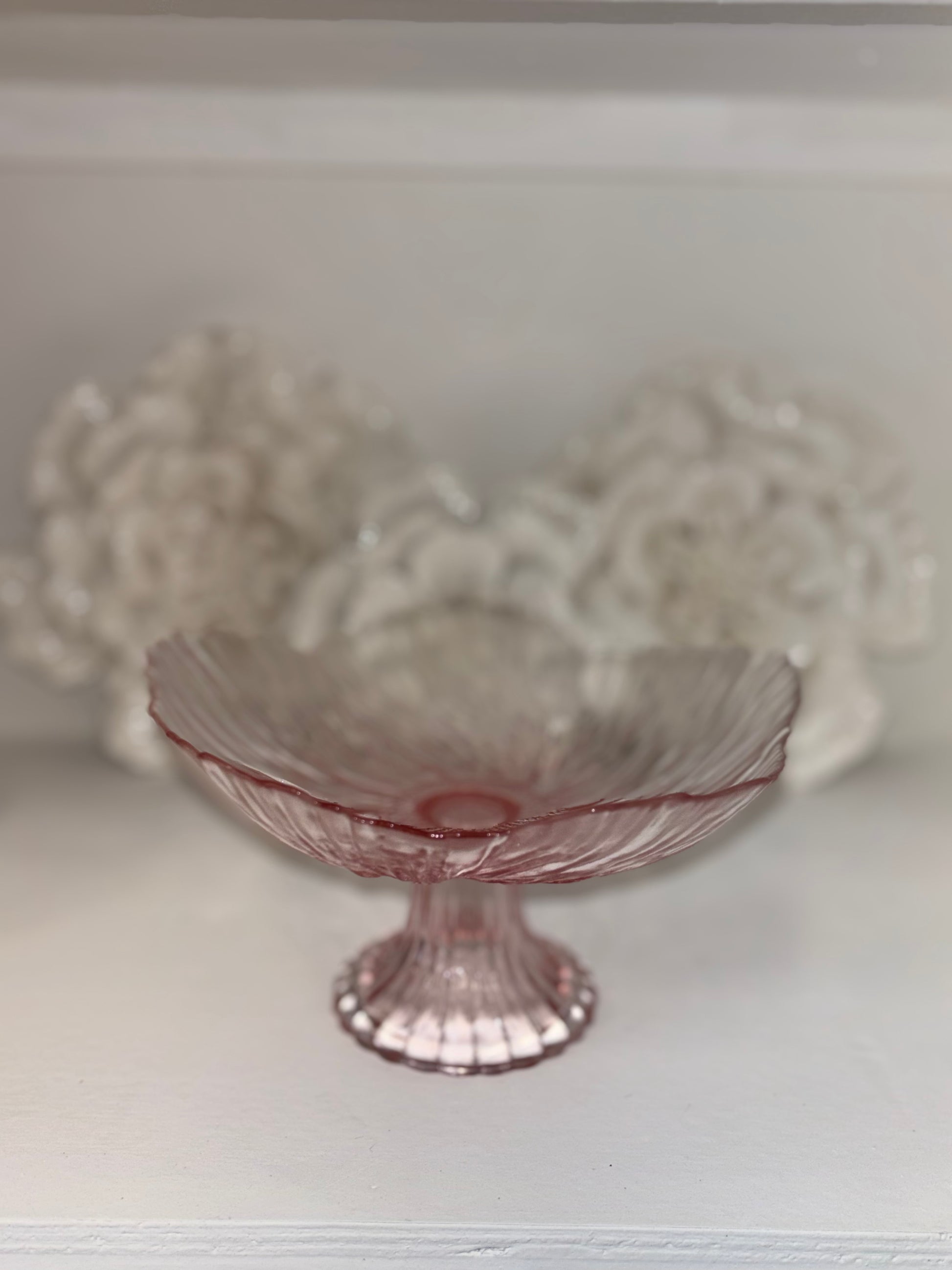 Handwash only/FDA approved. Valentine's Day cake pedestal with a light pink scalloped rim that looks like a flower petal.